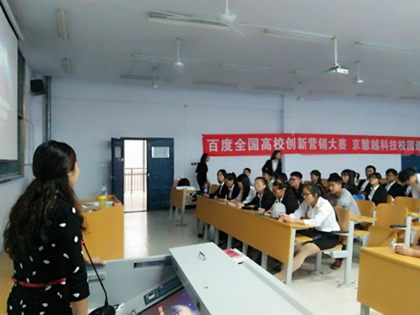 2016年9月26日下午4:30至5:30,以“互联天下,营销无界”为主题的第三届百度全国高校创新营销大赛宣讲在教学楼310多媒体教室顺利进行。大会由信息工程系陈晓红主任主持,邀请了百度营销大赛承办单位郑州京慧越科技有限公司讲师孙丹、陈基,信息工程系网络营销专业老师参会,参赛团队为主要培训对象。