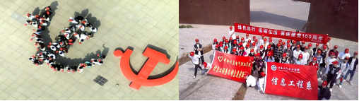 活动伊始,几十辆小绿车整齐的排放在校园内,班干部早早的把每辆车把两侧粘上小国旗和小党旗,每名志愿者都佩戴有庆祝建党百年标识的红色帽子。八点四十分活动队伍在西门列队集合,信息工程系主任陈晓红、学生科科长王旭、陈涛民、李晓伟、冯子原等多名老师和李晓伟班级60名学生志愿者一起参与了活动,陈主任在活动开始前,肯定了学生对本地主题活动的热情,并叮嘱学生活动期间要注意交通安全。9点准时从学校西门出发,绿色的车和飘扬的红旗成了马路上一道最亮眼的风景线。首站到达的是党建公园,五角星环绕着党徽,11名英勇的战士守卫着党徽,一场场战役,一位位先烈难忘的历史抨击着每名同学那颗爱国的心,全体成员在此肃然起敬。走过广场映入眼帘的是各种雕塑和党史文化墙,还有坦克、飞机等雕塑。整座公园以“讲述党的故事,传承红色精神”为设计理念,以中国共产党和驻许杨根思部队的发展历程为线索,同学们仔细观看仿佛置身于党艰苦历程的发展中,如此具有红色正能量及教育意义的建筑,热血澎湃的同学们都情不自禁留下合影,感受党的魅力所在。观看完后同学们自发在党徽旁用身体拼起了同比例的镰刀锤子,意味着青春向党,紧接着在五星广场前集体拉起了“绿色出行,低碳生活,喜迎建党100周年”横幅字样进行留念。