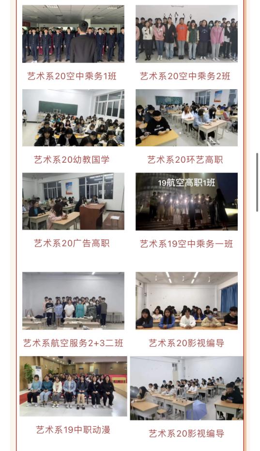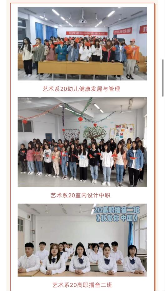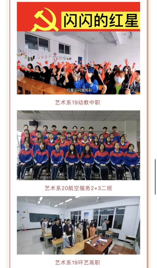 为迎接中国共产党成立100周年,点燃莘莘学子的爱国热情,4月19日至4月23日,艺术系举办了为期五天的“红歌班班唱”活动。同学们精心准备学唱了《我爱你中国》、《五星红旗迎风飘扬》、《歌唱祖国》等十几首红歌,他们利用下课和休息的时间强加练习,艺术系班级红歌旋律处处响起,形成了“班班有歌声,人人唱经典”的良好氛围。