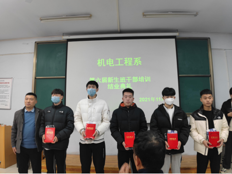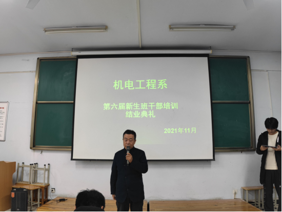 11月30日,机电工程系在教学楼A411举行新生学生干部培训班结业典礼,对班干培训学员进行表彰总结,机电工程系负责人张红凯、冯振华,系团总支杜羽老师,系学生科王会峰老师、程文浩老师出席本次结业典礼。