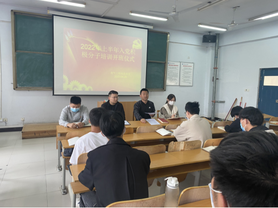 4月29日下午,电气工程系党总支在一期教学楼210举行了“2022年上半年入党积极分子培训班开班仪式”,教工支部副书记杜瑞涛、学生党支部书记周刚出席仪式并讲话。教工党支部组织委员徐爽、学生党支部组织委员李源、以及入党积极分子54余人参加仪式。