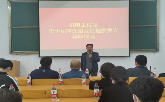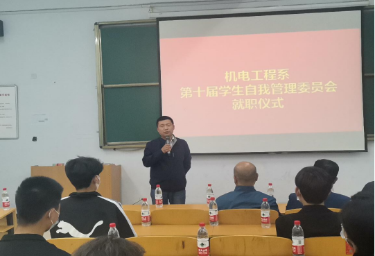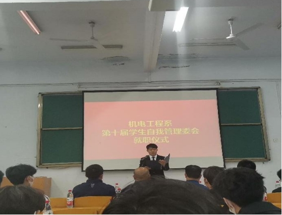 4月28日下午6:00,机电工程系在教学楼A511教室举行了机电工程系第十届学生自我管理委员会干部就职仪式。机电工程系党总支书记刘建刚,机电工程系主任张红凯、冯振华,系团总支杜羽老师,系学生科王会峰老师、程文浩老师,院学管会代表,院学生会代表,各系学管会代表和机电工程系2021级全体班长参加了此次大会。