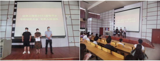 2022年高考在即,信息工程系为了让每一位专升本学子真实体验高考考试氛围,熟悉考试流程,明确考试要求,根据河南省教育厅的统一部署,落实关于“普通高考学生无声入场”会议精神,全方位、多举措为考生营造良好的考试环境,防范学生利用通讯工具作弊,于2022年6月1日下午在教学楼A第一阶梯教室组织136名专升本考生进行“考前动员大会以及无声入场演练活动”。