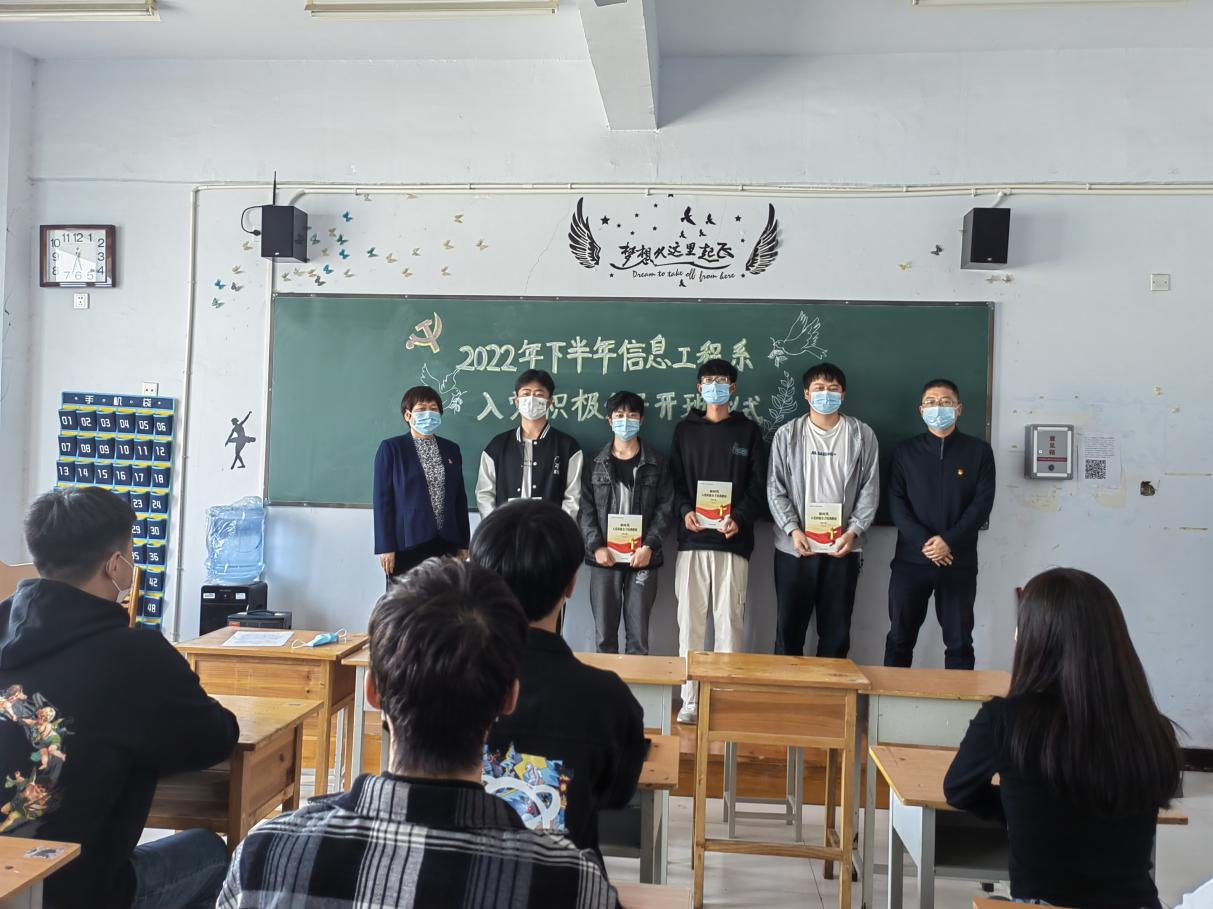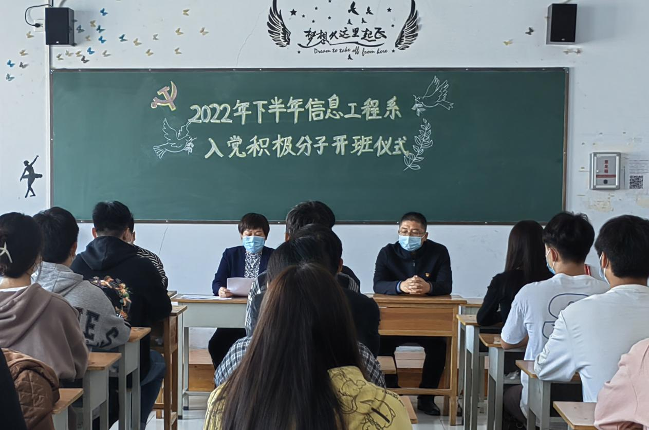 11月1日下午,信息工程系在教学楼A515教室举行了入党积极分子培训开班仪式。系党总支副书记陈晓红,系学生党支部书记王旭,系全体入党积极分子参加了开班仪式。仪式由系学生党支部组织委员李晓伟主持。