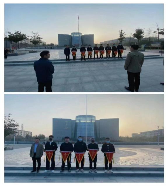 升旗完毕,机电工程系党总支副书记冯振华,副主任杜羽为优秀宿舍代表和优秀班级代表颁发了流动红旗。