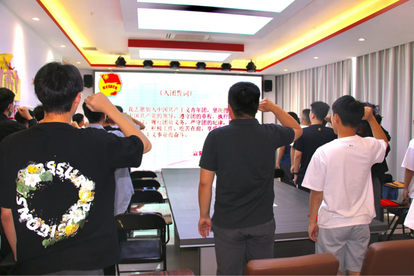 伴随着庄严雄壮的国歌声,入团仪式拉开了帷幕。大会宣读了新入团团员名单,为新团员佩戴团徽、颁发团员证。李源老师带领全体新团员宣誓,他们举起右拳,用最洪亮的声音,庄严宣誓,以崭新饱满的精神面貌,向团组织表明决心。