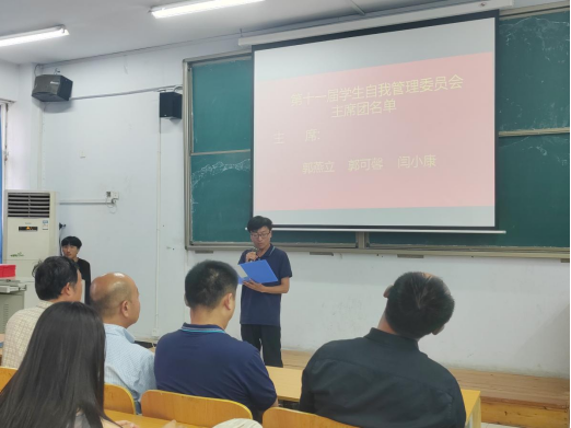 第十届自管会主席代表李志博对任职期间的工作做了总结,回顾一年来自管会在学生科老师领导下开展的各项工作,并对新一届自管会工作寄予希望,传递自管会干部的责任与担当。随后第十一届自管会主席代表郭燕立宣读了就职报告,表示定会发挥好学生干部领头作用,敢于担当,守正出新,再创辉煌,并带领新任主席团和全体自管会成员进行了庄严宣誓。