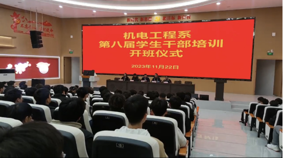 11月22日,机电工程系第八届学生干部培训班开班仪式在VR思政中心举行,机电工程系党总支副书记冯振华、系副主任王会峰、系团总支书记程文浩、系党政办主任别虎伟以及参与培训的2023级182名学生干部参加仪式。本次培训主题为如何当好学生干部、学生干部的工作方法及技巧、学生干部如何参与处理校园突发事件、相关文件的解读等,同时举办丰富多彩的文体活动。会议要求参训学生干部要认真学习,严格要求自己,做到自信、自律、自强,将学到的知识更好的服务班级、服务同学。