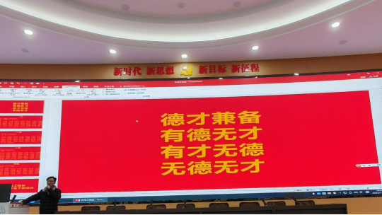 开班仪式后,系团总支书记程文浩为全体学生干部讲授第一课,他从“净、静、敬、竞”四个字,“德、才”两个维度出发,在廉洁自律、平心静气、敬畏之心、勇于竞争等方面与参训学员进行交流。他要求全体班干部要能够正视角色、明确职责、严于律己、以身作则,加强专业学习,谱写自己未来的华丽篇章。
