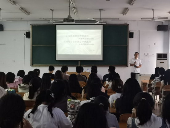 本次企业宣讲邀请了上海倾城美容护肤连锁及苏州巴黎世家美容护肤连锁的负责人为同学们带来精彩的演讲,他先介绍了公司发展的具体情况,并针对招聘岗位、薪酬福利、公司制度等方面进行了详细的讲解。随后,该负责人分享了其个人的成长经历,为同学们梳理了学业规划、行业发展、就业趋势等,并阐述了进入实习就业阶段后自身应具备的职业素养。全体学生认真聆听,受益匪浅。