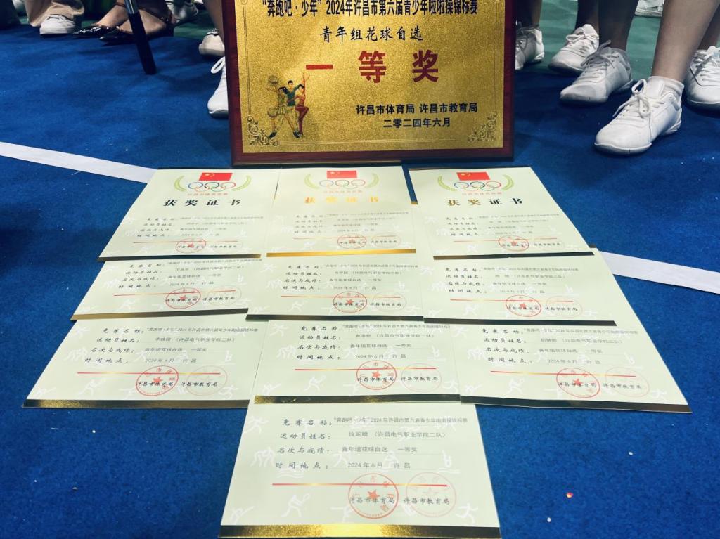 本次赛事,我院信息工程系啦啦队于青年组自选花球第4个上场,身着色彩鲜艳的服装,精神抖擞地为大家展示这场视觉盛宴!随着音乐声响起,她们踩着动感的鼓点,迈着轻盈的脚步,如跳跃的精灵在赛场上闪光,或热情奔放,或柔美优雅,用灵动的身姿和欢快的节奏,诠释着啦啦操的活力与魅力,最终许昌电气职业学院信息工程系啦啦队荣获“奔跑吧·少年”2024年许昌市第六届青少年啦啦操锦标赛青年组花球自选“一等奖”!