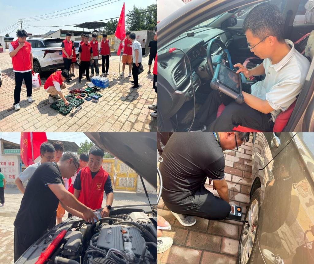 汽车检修服务“最后一公里”。村文化广场和田间地头成为志愿服务首选“工作站”。程文浩、陈阳阳老师带领志愿服务队分工协作,三液检查(冷冻液、刹车液、机油)、胎压检测、常规故障及日常灯光故障检测等次第展开。