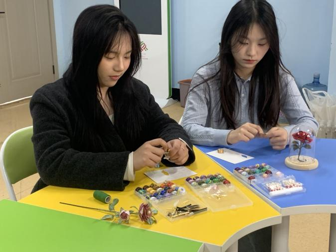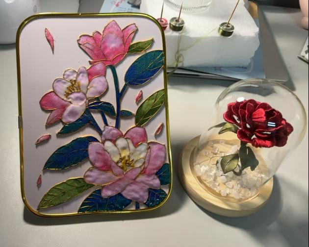 体验环节,学院非遗工坊志愿者们进行悉心指导,讲解并演示了缠绕花瓣、捋丝和制作花纹的方法,同学们积极动手,用指尖创作出富有创意的作品。那一件件精美的缠花作品,恰似春日里肆意绽放、争奇斗艳的繁花,每一片花瓣都仿佛承载着悠悠岁月的故事,在无声诉说着往昔的繁华与传承;而掐丝珐琅制品,则宛如隐匿在岁月深处的神秘宝藏,散发着迷人且独特的光泽,轻而易举地将众人引入传统技艺编织的绮丽世界。