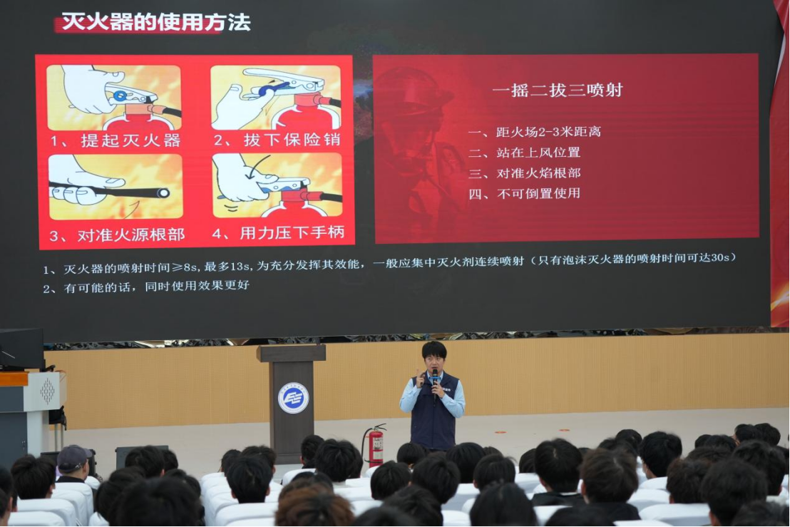 学院邀请到河南省安全消防协会义务消防科普宣传服务队宣传员张帅教员担任主讲。通过真实案例视频、互动问答等形式,张教官详细讲解了火灾成因、灭火器分类及使用方法、逃生注意事项等知识,重点强调“弯腰低姿捂口鼻”“不乘电梯、不贪财物”等逃生原则。现场师生认真记录,积极参与灭火器操作模拟。