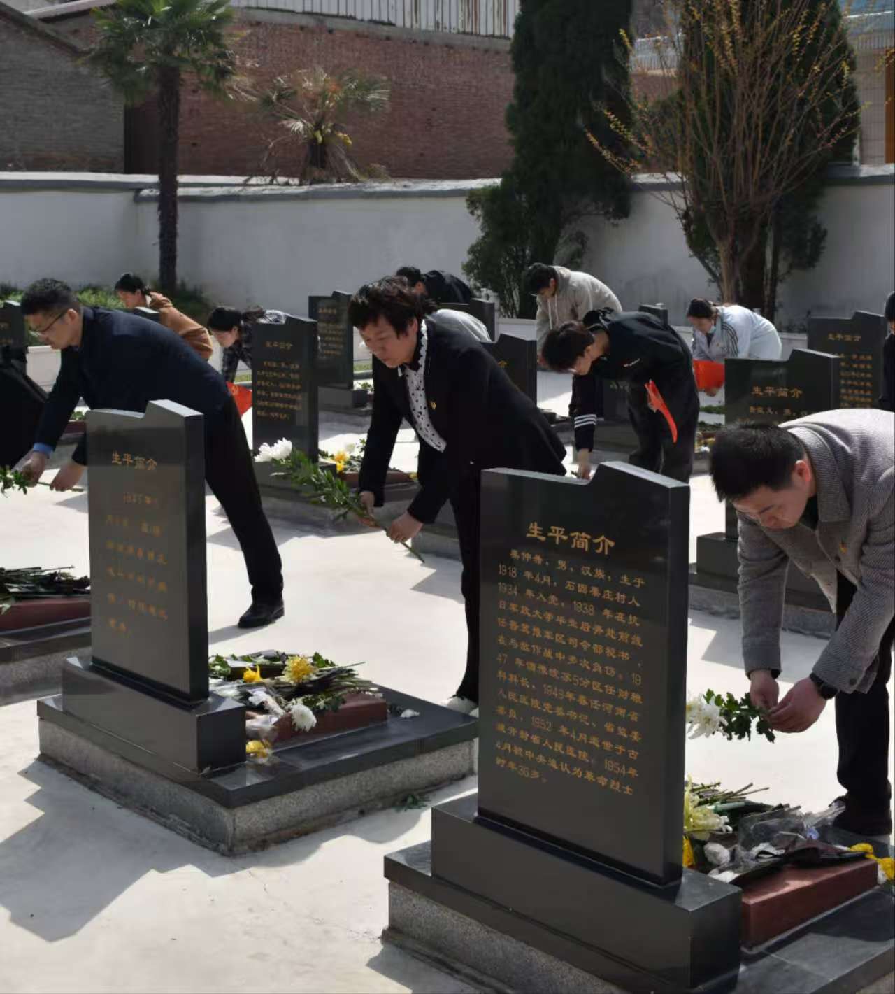 在献花环节,学院领导缓步上前,向革命烈士纪念碑敬献花束。随后在领导及老师的带领下,各位学生代表依次站在烈士墓碑前,将手中的鲜花献给了为祖国繁荣富强做出贡献的烈士们,全体师生整齐划一的三次鞠躬,让胸前的党徽、团徽与碑上的红星交相辉映。洁白的菊花在阳光下绽放,寄托着全体师生对革命先烈的崇高敬意和深切缅怀。