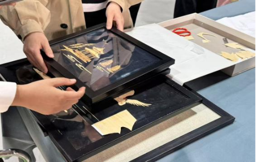 踏入杨丽工作室,古色古香的工作台上金丝般的麦秸拼贴出山河脉络,空气中浮动着麦香与矿物颜料的沉静气息。“从蒸煮软化到刮丝抛光,每根麦秸需历经十二道工序方能成为艺术载体。”杨丽手持半成品麦秸画,向师生们展开了一堂生动的非遗技艺课。