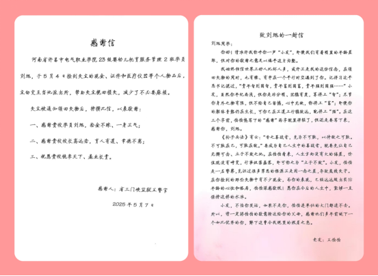 这面锦旗和感谢信,不仅是对刘旭个人的褒奖,更激励着全体师生在践行社会主义核心价值观的道路上不断前行。这起拾金不昧的事件,虽然看似普通,却如同一颗闪耀的星星,照亮了校园的每一个角落,传递着满满的正能量,让我们看到了当代大学生的责任与担当,也让我们坚信,在文明的校园里,温暖与善良从未缺席。