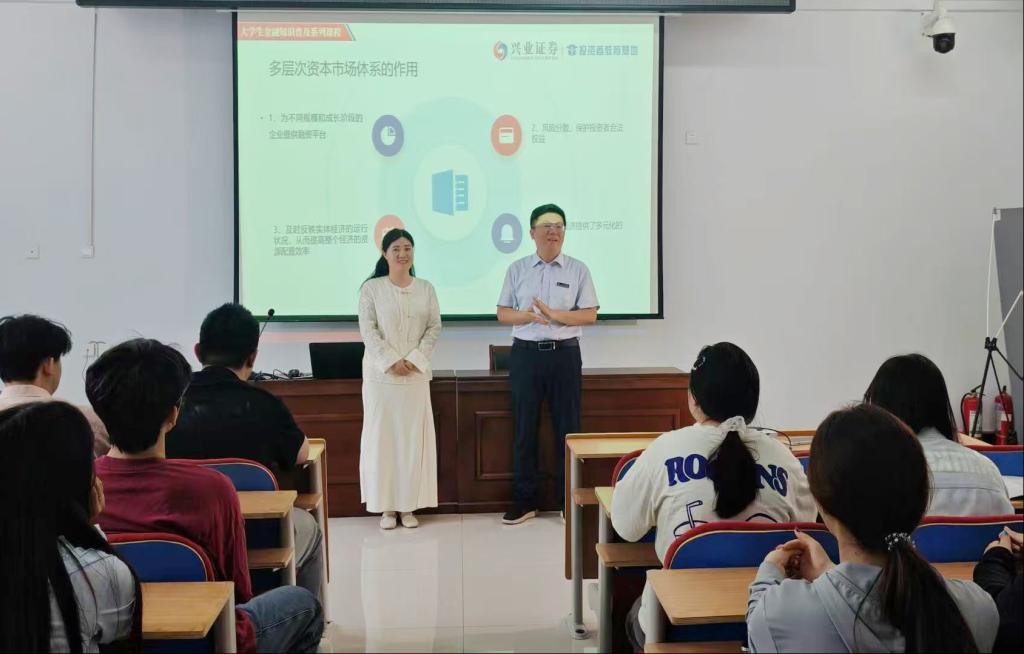 在理论课堂环节,学院教师率先登场,以扎实的学术功底为同学们搭建起资本市场的理论框架。她从资本市场的定义、分类出发,系统阐述了资本市场的功能、运行机制和监管体系,结合经典金融理论,为同学们详细解读了资本市场的基本概念与运作原理。随后,兴业证券的行业专家结合当下金融市场动态,以真实企业投融资案例为切入点,深入剖析资本市场的实际应用。在问答环节,同学们的提问一个接着一个,企业专家始终耐心回应,将晦涩的专业知识转化为通俗易懂的行业洞察,让整个课堂充满思维碰撞的火花。