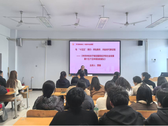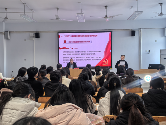 为深入学习贯彻国家“十五五”规划纲要精神,推动规划部署与立德树人根本任务深度融合,12月3日下午,副院长贾楠走进艺术与设计学院(人文学院),以 “与‘十五五’同行:师生携手,共赴时代新征程”为主题,为100余名师生讲授了一堂立意高远、内涵丰富的专题思政课。艺术与设计学院(人文学院)全体教职工、2025年上半年发展的全体入党积极分子及部分学生代表聆听学习。