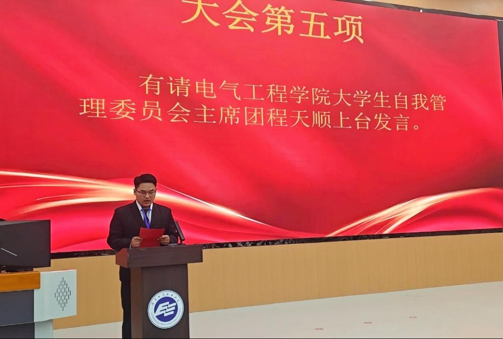 主席团代表程天顺同学在会上发言。他围绕自管会未来的工作规划与责任担当进行了阐述,表示将带领团队以“诚信善思,崇德励志”的校训为指引,切实履行服务宗旨。其发言真挚有力,引发了现场师生的共鸣,赢得阵阵掌声。