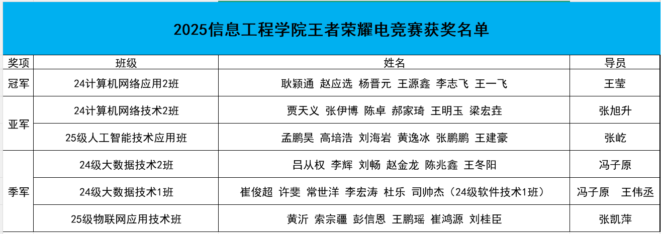 本次信息工程学院王者荣耀班级对抗赛获胜队伍如下: