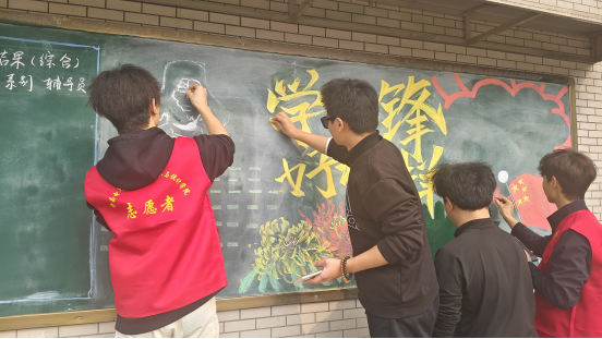 绘制过程中,同学们相互交流设计思路、分享绘画技巧,认真对待每一个创作细节。大家以耐心和细心执笔,把对雷锋精神的真切感悟融入笔下,让一块块原本普通的黑板,变成了传递正能量、弘扬雷锋精神的 “鲜活课堂”。